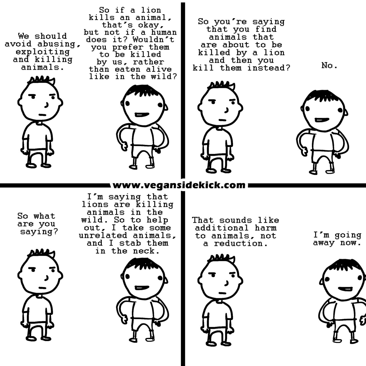 It is an interesting philosophical question that you're posing here +Kitteh Equaliteh, and I did not mean to be coy before in my response; I earnestly thought I was answering your question. In essence, you're asking why it is that I am arguing against humans killing other animals, but why I'm not concerned about non-humans killing other animals, right?