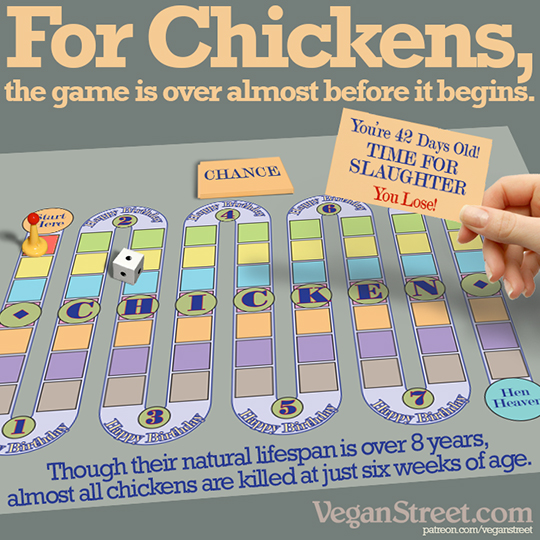 The hens that lay eggs go through "forced molting", which translates as giving her no feed for seven to fourteen days at a stretch, causing her reproductive cycle to reset. They are forced to undergo this process several times during their life, which is cut dreadfully short; she will live two years or less, until her body is exhausted from the stresses of constant laying and her egg production decreases. When you consider that she would live to be eight to ten years if left to her own devices, she is essentially killed as teenager.
