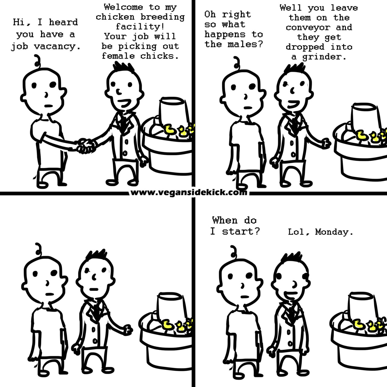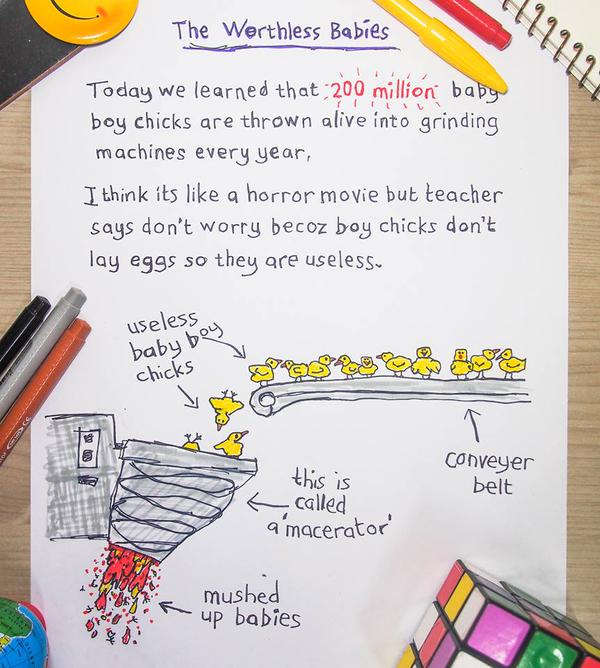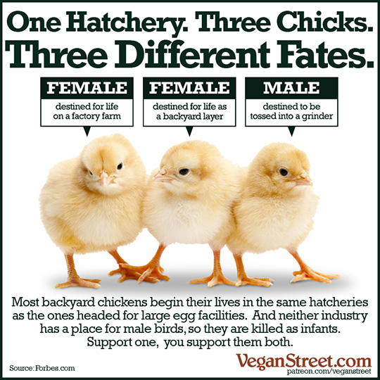 I'm sad to say, +Chicken Little, that eggs are much more suffering laden than you realize. The horrors start at hatching, with all the males being disposed of, and usually in torturous ways (e.g. being ground alive for use in chicken nuggets, or being electrocuted, or even thrown in the garbage with the bag tied shut to slowly suffocate to death under the weight of his siblings).