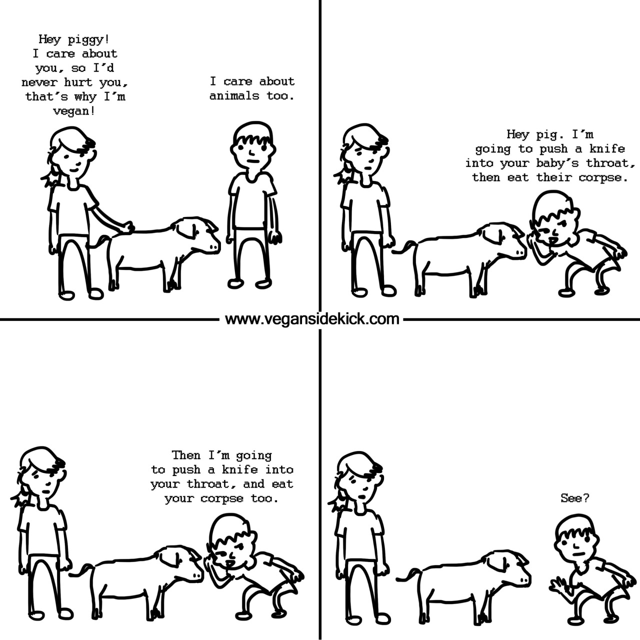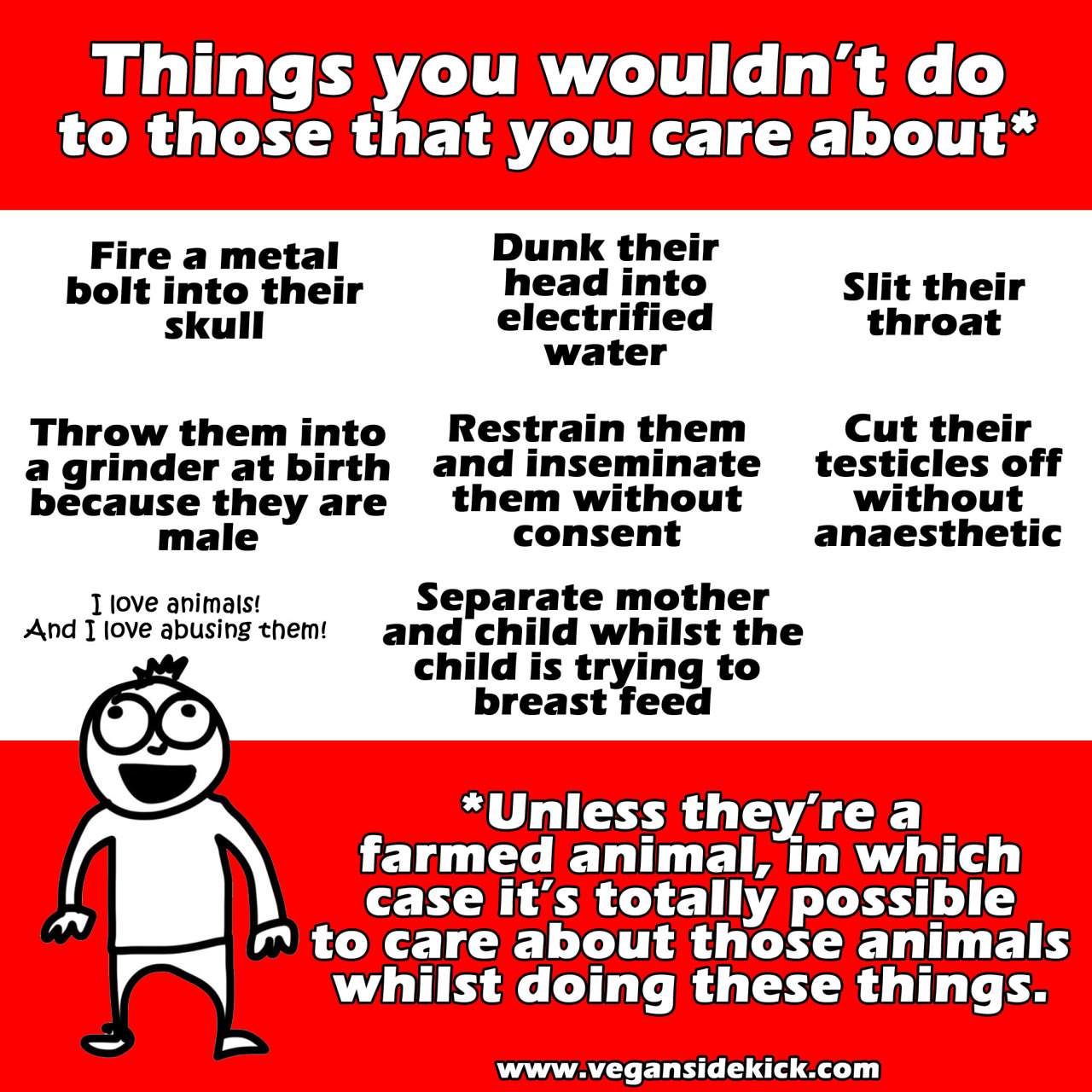 In order to eat meat, an animal lover must be comfortable with the sexual violation of cows, pigs, sheep, goats and other beings via artificial insemination. In order to drink milk, an animal lover must be comfortable with the separation of a mother cow from her calf and with the raising of that calf in a veal crate for the few months it is permitted to live. In order to eat eggs, an animal lover must be comfortable with the crushing and suffocation of billions of male chicks per year, since males are not useful to the egg industry. None of these things are acts of love.